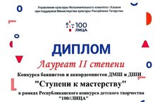 В апреле в г. Казань под управлением культуры Исполнительного комитета г. Казани при поддержке Министерства культуры Республики Татарстан проходил Конкурс баянистов и аккордеонистов ДМШ и ДШИ "Ступени к мастерству" в рамках Республиканского конкурса детского творчества "100//ЛИЦА". В конкурсе приняли участие: ансамбль баянистов под управлением преподавателя А.Ф. Евграфовой и Давлиев Самат (класс преподавателя А.Ф. Евграфовой) и стали лауреатами II степени. Поздравляем ребят и их преподавателя Айгуль Фаритовну с отличными результатами конкурса. Желаем вам дальнейших успехов и побед! Администрация школы выражает благодарность преподавателю школы Евграфовой А.Ф. за ее труд и подготовку учащихся к конкурсу.