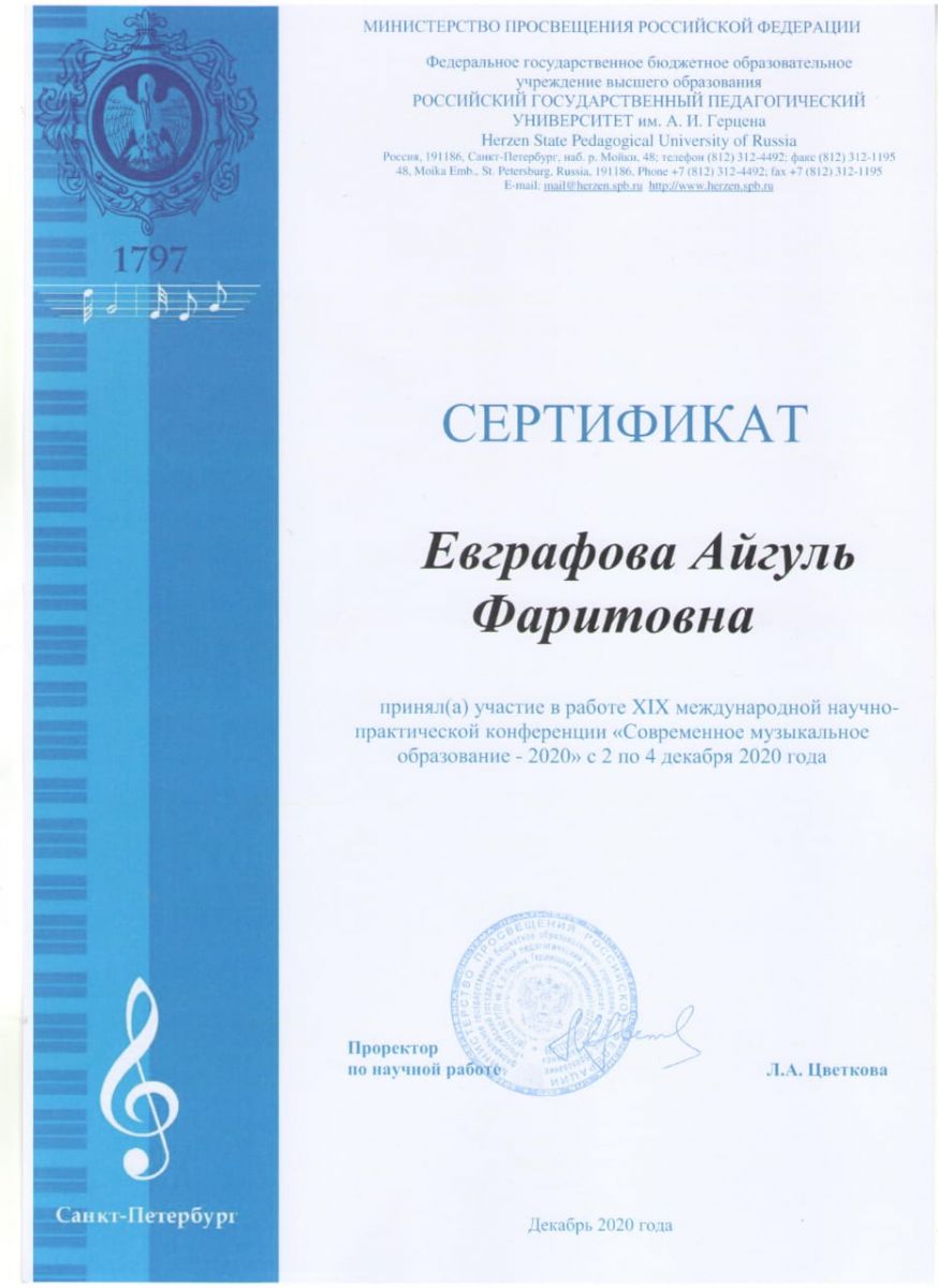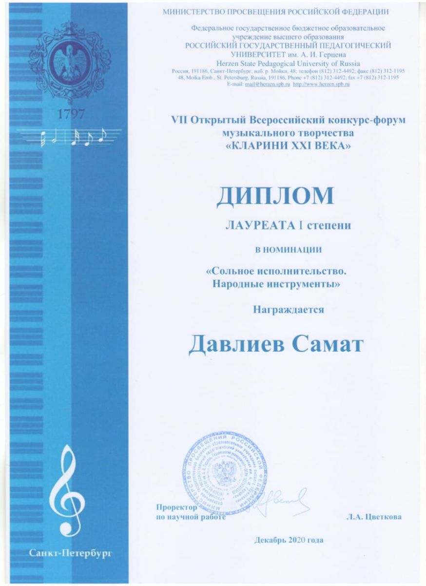 В Санкт-Петербурге прошла XIX международная научно-практическая конференция "Современное музыкальное образование", в работе которой поняла участие преподаватель народного отделения Евграфова Айгуль Фаритовна. В рамках данной конференции состоялся VII Открытый Всероссийский конкурс-форум музыкального творчества "КЛАРИНИ XXI ВЕКА", в котором принял участие учащийся народного отделения Давлиев Самат (класс преподавателя А.Ф. Евграфовой). Самат стал обладателем диплома лауреата I степени. Поздравляем Айгуль Фаритовну и Самата с отличными результатами и желаем дальнейших творческих успехов. Администрация школы благодарит Евграфову Айгуль Фаритовну за подготовку учащегося к конкурсу.