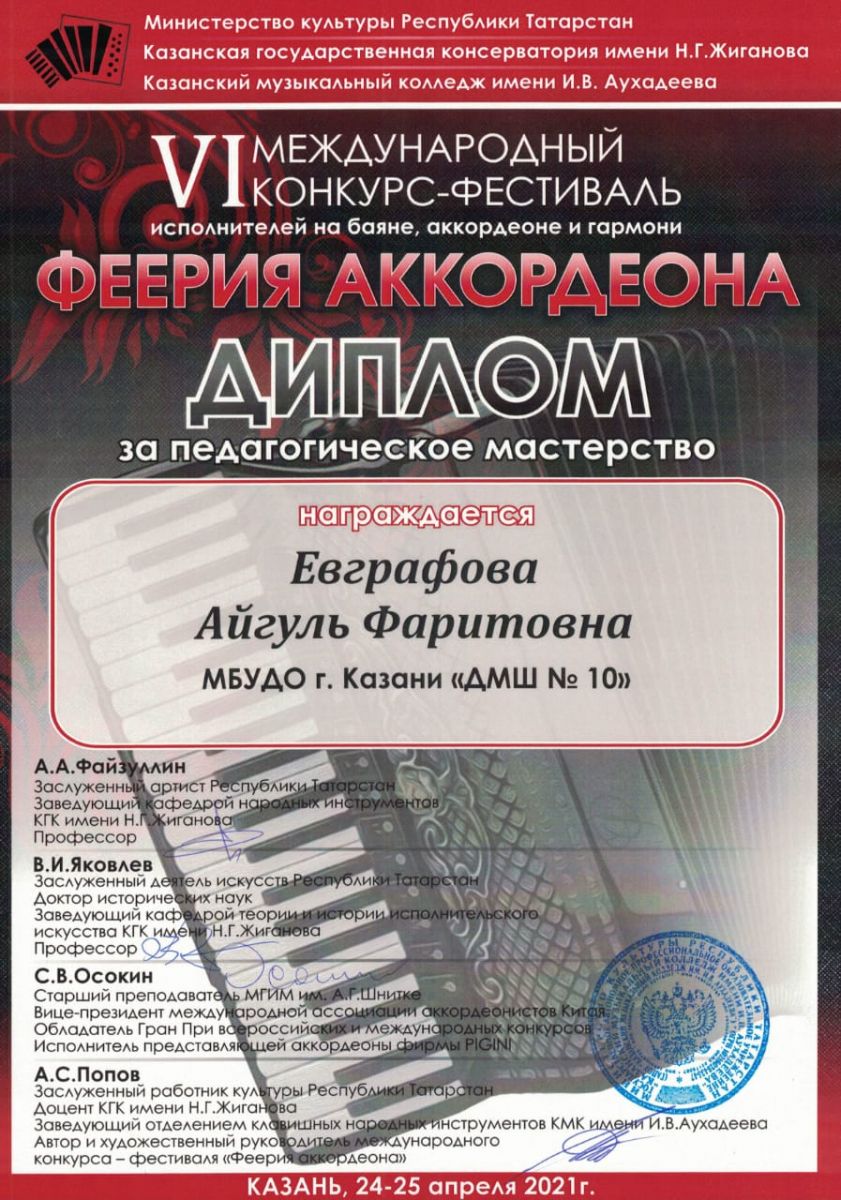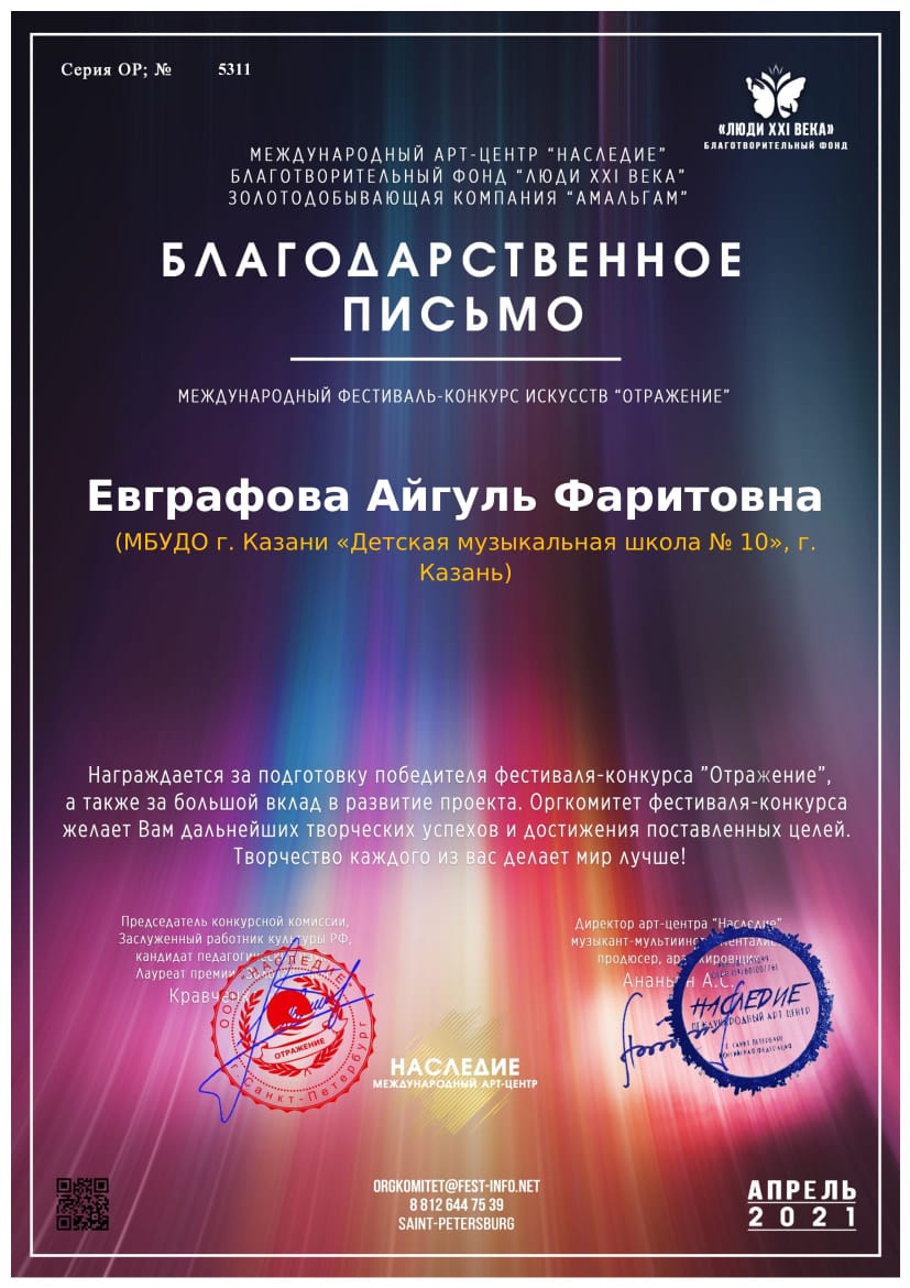 В апреле состоялся международный фестиваль-конкурс искусств "Отражение", в котором принял участие ансамбль баянистов "Дуслык" под управлением преподавателя МБУ ДО г. Казани Евграфовой Айгуль Фаритовны и Давлиев Самат (класс преподавателя Евграфовой А.Ф.) Ансамбль баянистов стал обладателем диплома лауреата I степени, а Давлиев Самат был отмечен дипломом лауреата II степени. Поздравляем ребят и их преподавателя с отличным выступлением на конкурсе. Желаем вам дальнейших успехов в творчестве. Администрация школы вырадает благодарность преподавателю А.Ф. Евграфовой за подготовку ребят к конкурсу.