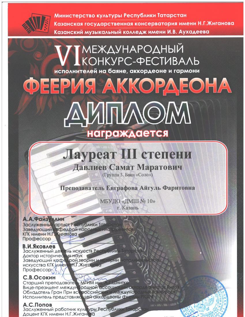 24-25 апреля в КДК им. Ленина проходил VI Международный конкурс-фестиваль исполнителей на баяне, аккордеоне и гармони "ФЕЕРИЯ АККОРДЕОНА", в котором принял участие учащийся народного отделения Давлиев Самат (класс преподавателя Евграфовой Айгуль Фаритовны), став обладателем диплома лауреата III степени. Поздравляем Самата и его преподавателя с отличным результатом конкурса. Желаем вам вдохновения и дальнейших успехов. Администрация школы вырадает благодарность преподавателю А.Ф. Евграфовой за подготовку учащегося к конкурсу.
