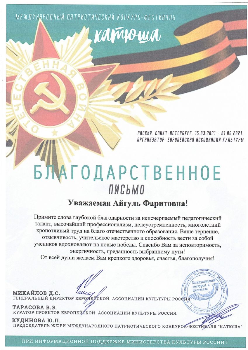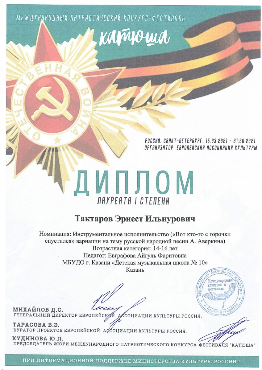 В г. Санкт-Петербург прошел Международный патриотический конкурс-фестиваль "Катюша", в котором принял участие ученик нашей школы Тактаров Эрнест (класс преподавателя А.Ф. Евграфовой) и выступил с отличным результатом, завоевав диплом лауреата I степени. Поздравляем Айгуль Фаритовну и Эрнеста с победой в конкурсе и желаем дальнейших успехов! Администрация школы выражает благодарность Евграфовой Айгуль Фаритовне за подготовку учащегося к конкурсу.