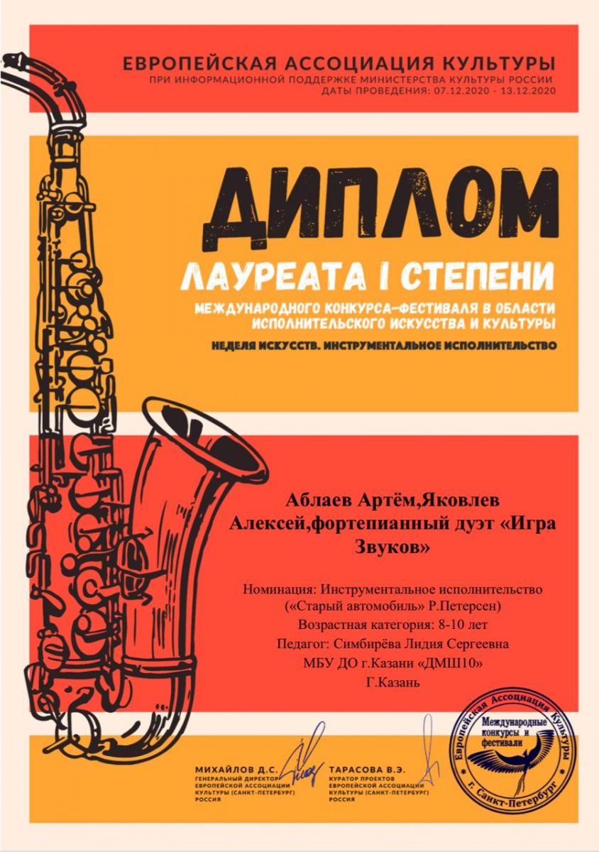 В г. Казань с 7 по 13 декабря 2020 г. прошел Международный конкурс - фестиваль в области исполнительского искусства и культуры, при информационной поддержке Министерства культуры России, на котором ученики нашей школы Аблаев Артем и Яковлев Алексей в составе фортепианного дуэта "Игра звуков" под руководством преподавателя Симбиревой Лидии Сергеевны, в номинации "Инструментальное исполнительство", стали обладателями диплома лауреата I степени!.Поздравляем ребят с победой и желаем дальнейших творческих успехов. Администрация школы выражает благодарность преподавателю Симбиревой Л.С. за подготовку учащихся к конкурсу.