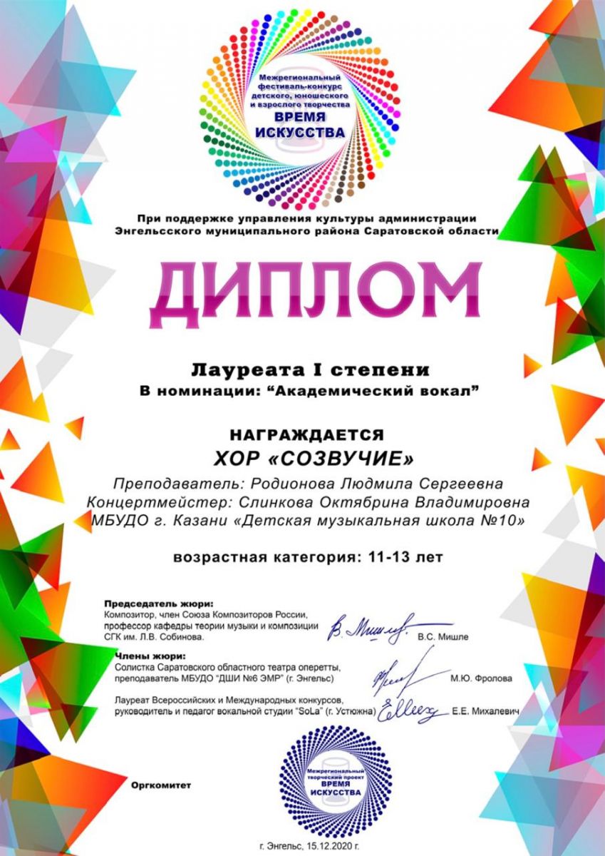 15 декабря в г. Энгельс прошел Межрегиональный фестиваль - конкурс "Время искусства", в котором принял участие хор "Созвучие" МБУ ДО г.Казани "ДМШ №10" (руководитель Родионова Людмила Сергеевна, концертмейстер Слинкова Октябрина Владимировна) с прекрасным результатом и стал лауреатом I степени. Поздравляем учащихся и преподавателей Родионову Л.С. и Слинкову О.В. с очередной победой в конкурсе и желаем дальнейших успехов и вдохновения! Администрация школы выражает благодарность преподавателям Родионовой Л.С. и Слинковой О.В. за профессионализм и отличную подготовку учащихся к конкурсу!