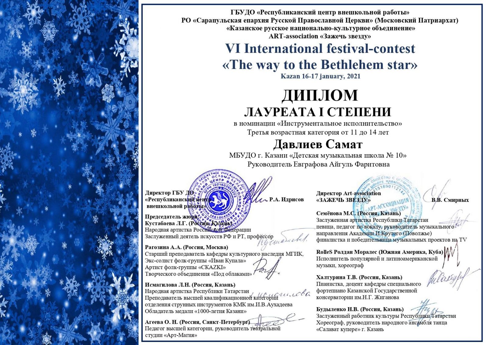16-17 января в г. Казань проходил IV Международный конкурс "Путь к Вифлеемской звезде", на котором ученик нашей школы Давлеев Самат (класс преподавателя Евграфовой А.Ф.) завоевал диплом лауреата I степени. Поздравляем Самата и его преподавателя Евграфову А.Ф. с очередным блестящим выступлением и победой на конкурсе и желаем дальнейших творческих побед! Администрация школы выражает благодарность преподавателю Евграфовой А.Ф.за подготовку учащегося к конкурсу.