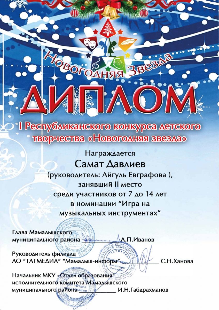 Сегодня стали известны итоги I Республиканского конкурса видеороликов "Новогодняя звезда", организованного филиалом АО "ТАТМЕДИА" "Мамадыш-информ". В этом году председателем жюри конкурса "Новогодняя звезда" стал звезда татарской эстрады, певец и шоумен Мунир Рахмаев. Нашу школу на данном конкурсе представлял учащийся отделения "Народные инструменты" Давлиев Самат (класс преподавателя Евграфовой Айгуль Фаритовны) в номинации "Игра на музыкальных инструментах" и занял II место! Поздравляем Самата и его преподавателя Евграфову Айгуль Фаритовну с очередной победой и желаем дальнейших творческих успехов! Администрация школы выражает благодарность преопдавателю Евграфовой А.Ф. за подготовку учащегося к конкурсу.