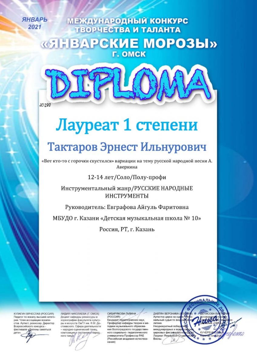 В январе 2021 г. в г. Омск прошел Международный конкурс творчества и таланта "Январские морозы", на котором ученик нашей школы Тактаров Эрнест (класс преподавателя Евграфовой А.Ф.) завоевал диплом лауреата I степени. Поздравляем Эрнеста и его преподавателя с отличным результатом и желаем дальнейших побед. Администрация школы благодарит Евграфову А.Ф. за подготовку учащегося к конкурсу.