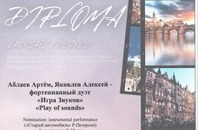 В г. Прага (Чехия) прошел Международный конкурс фестиваля исполнительского искусства и мировой культуры "PRAGUE FEST-2020", в котором приняли участие ученики нашей школы Аблаев Артем и Яковлев Алексей в составе фортепианного дуэта "Игра звуков", под руководством преподавателя Симбиревой Лидии Сергеевны, став обладателями диплома лауреата I степени. Поздравляем и желаем новых побед! Администрация школы выражает благодарность преподавателю Симбиревой Л.С. за подготовку учащихся к конкурсу.