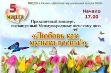 Сегодня в актовом зале ДМШ № 10 состоялся праздничный концерт "Любовь как музыка весны!", посвященный Международному женскому дню - 8 Марта. Концерт, подготовленный преподавателями народного отделения, прошел на одном дыхании, ярко и красочно. В зале царила атмосфера праздника, вдохновения и радости. Звучала прекрасная музыка.