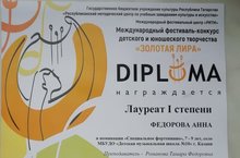 16 - 17 марта в Казани проходил Международный фестиваль - конкурс детского и юношеского творчества "Золотая лира". В конкурсе приняла участие учащаяся фортепианного отделения класс преподавателя Романовой Тамары Федоровны - Федорова Анна.