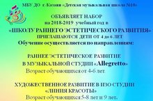 МБУ ДО г. Казани "Детская музыкальная школа № 10" (пос. Юдино, ул. Революционная, д. 49; тел. 294-33-27) объявляет набор на 2018-2019 учебный год в "Школу раннего эстетического развития". Приглашаются дети от 4 до 6 лет.