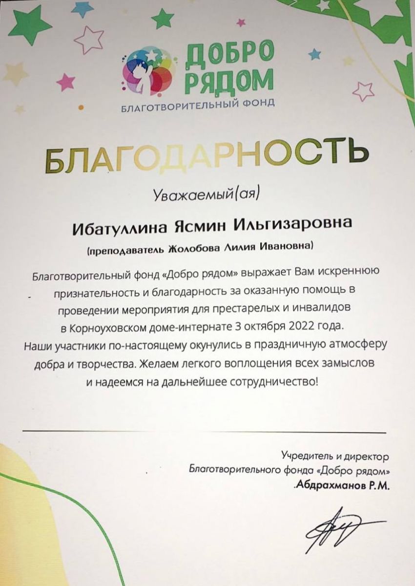Благотворительный фонд «Добро рядом»выразил искреннюю благодарность ученице МБУДО "ДШИ№10" г. Казани Ибатуллиной Ясмин (класс преподавателя Жолобовой Л.И.) за оказанную помощь в проведении мероприятия для престарелых и инвалидов в Корноуховском доме-интернате.