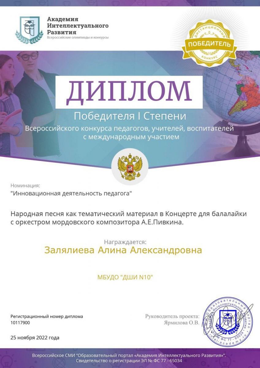 Поздравляем Залялиеву А.А.,которая стала победителем 1степени во Всероссийском конкурсе педагогов,учителей,воспитателей со своей работой «Народная песня как тематический материал в концерте для балалайки с оркестром мордовского композитора А.Е.Пивкина.