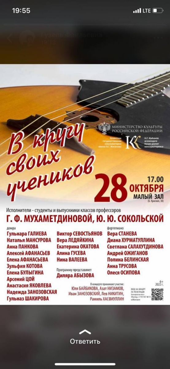 28октября в Малом зале Казанской консерватории состоялся Концерт учеников и выпускников классов заслуженной артистки Татарстана Гузель Мухаметдиновой и народной артистки Татарстана Юзефины Сокольской «В кругу своих учеников». Среди участниц преподаватель отделения народных инструментов "ДШИ №10" г. Казани, Залялиева Алина Александровна.