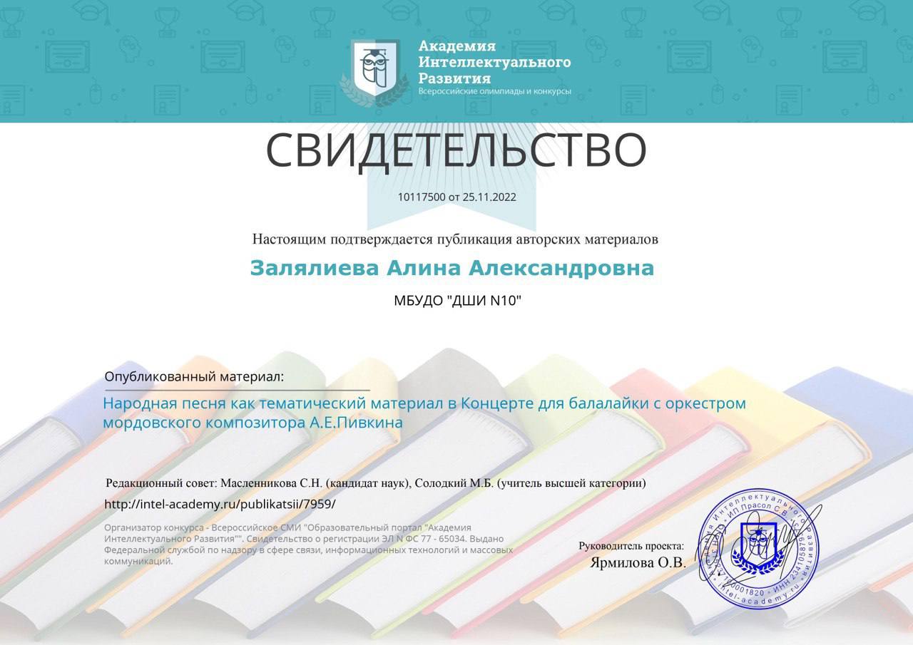 -Свидетельство о публикации материала «Народная песня как тематический материал в концерте для балалайки с оркестром мордовского композитора А.Е.Пивкина».