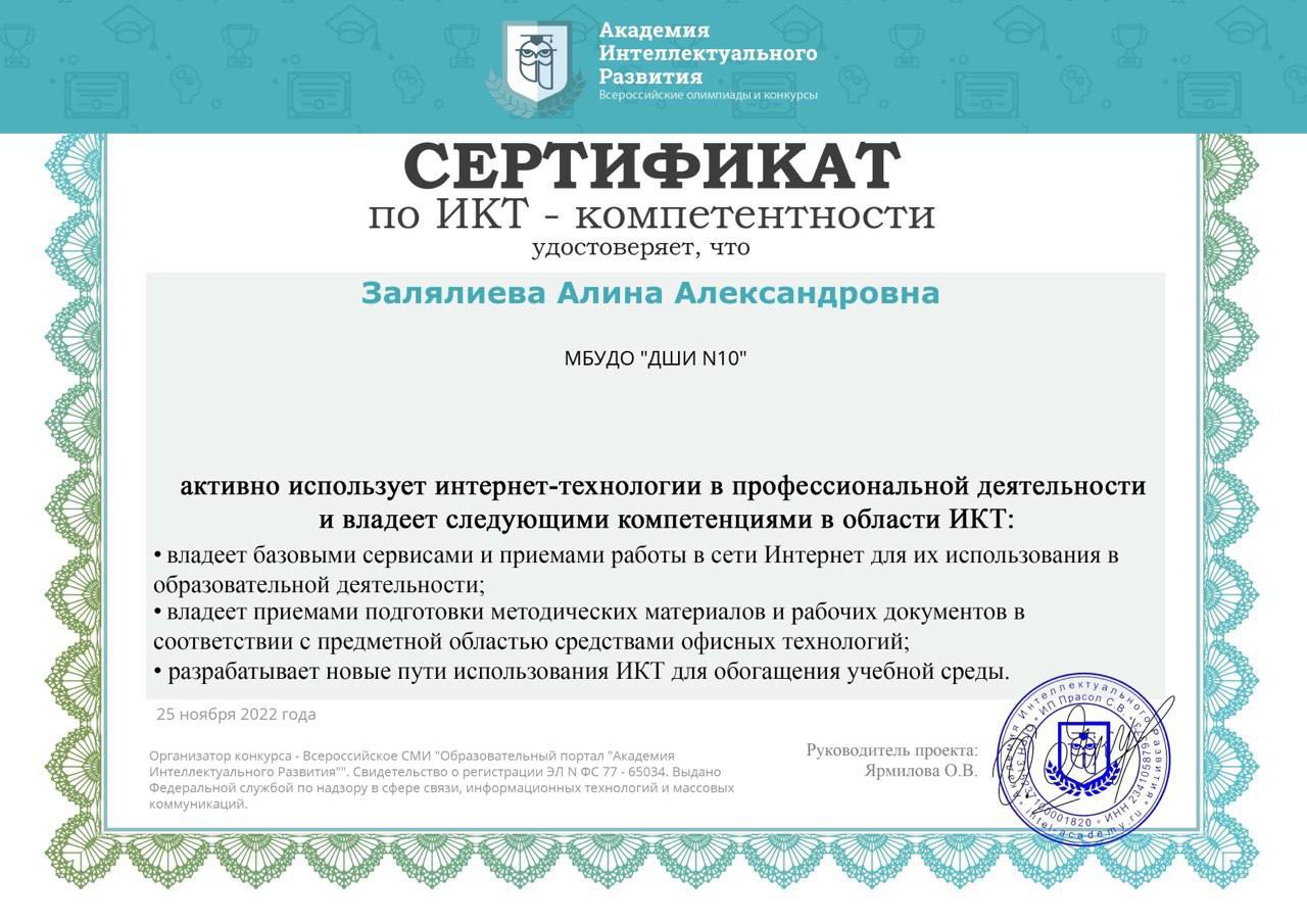 -Сертификат по ИКТ компетентности, который удостоверяет, что Алина Александровна активно использует интернет-технологии и владеет компетенциями в области ИКТ.