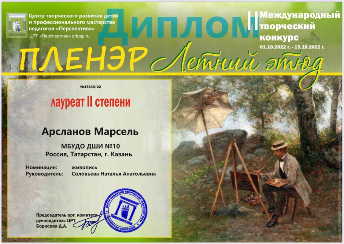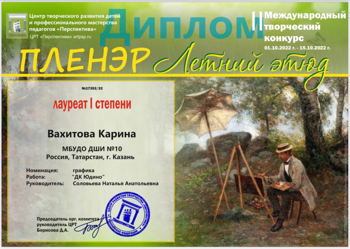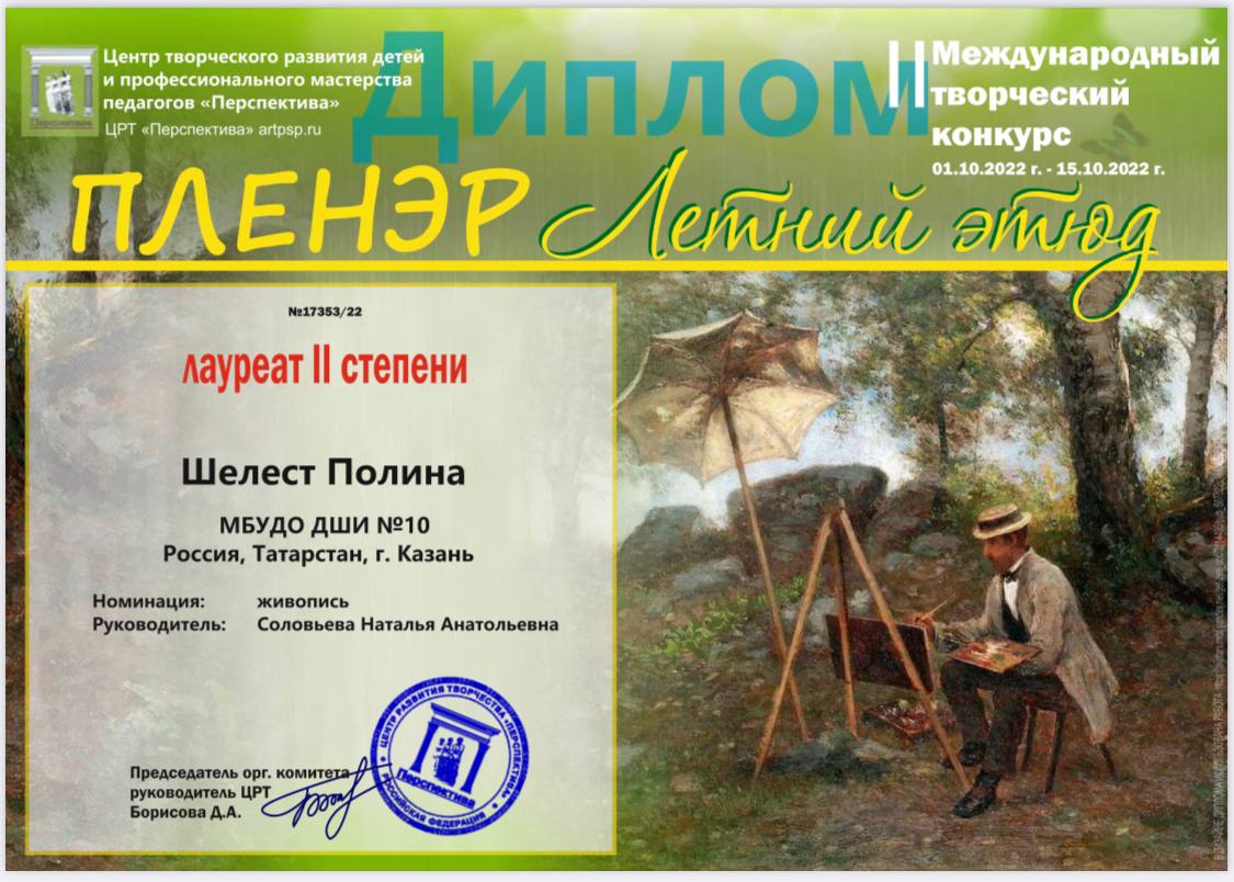 Поздравляем учащихся художественного отжеления МБУДО "ДШИ №10" г. Казани с победами во II Международном творческом конкурсе Плэнере «Летний этюд»: