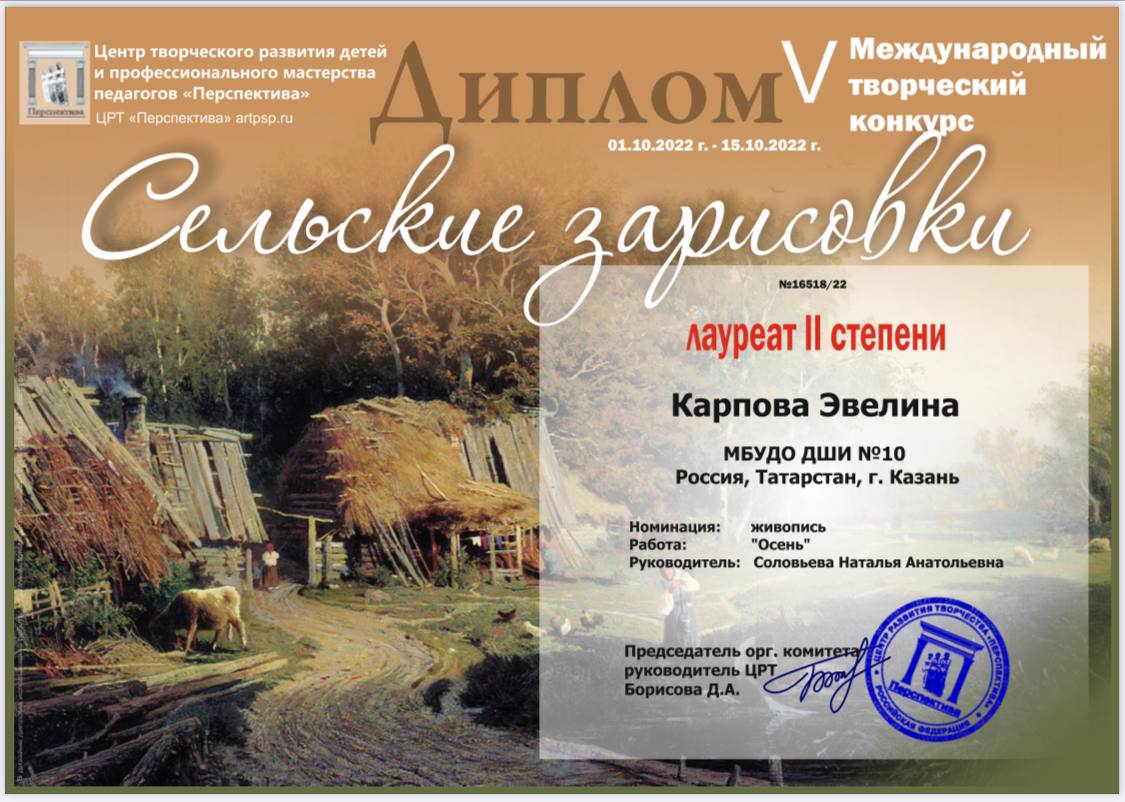 Поздравляем учащихся и преподавателя художественного отделения Соловьеву Наталью Анатольевну с победами в V Международном творческом конкурсе «Сельские зарисовки»: