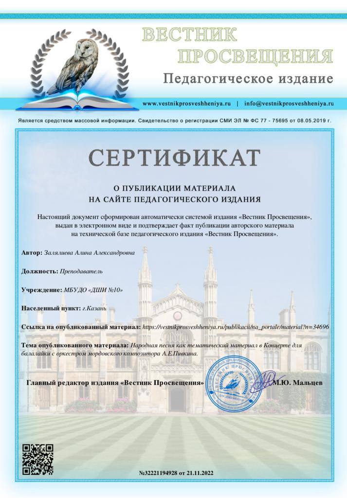 Поздравляем преподавателя народного отделения Залялиеву Алину Александровну с получением сертификата, подтверждающего факт публикации авторского материала на технической базе педагогического издания «Вестник Просвещения» по теме: «Народная песня как тематический материал в концерте для балалайки с оркестром мордовского композитора А.Е.Пивкина»