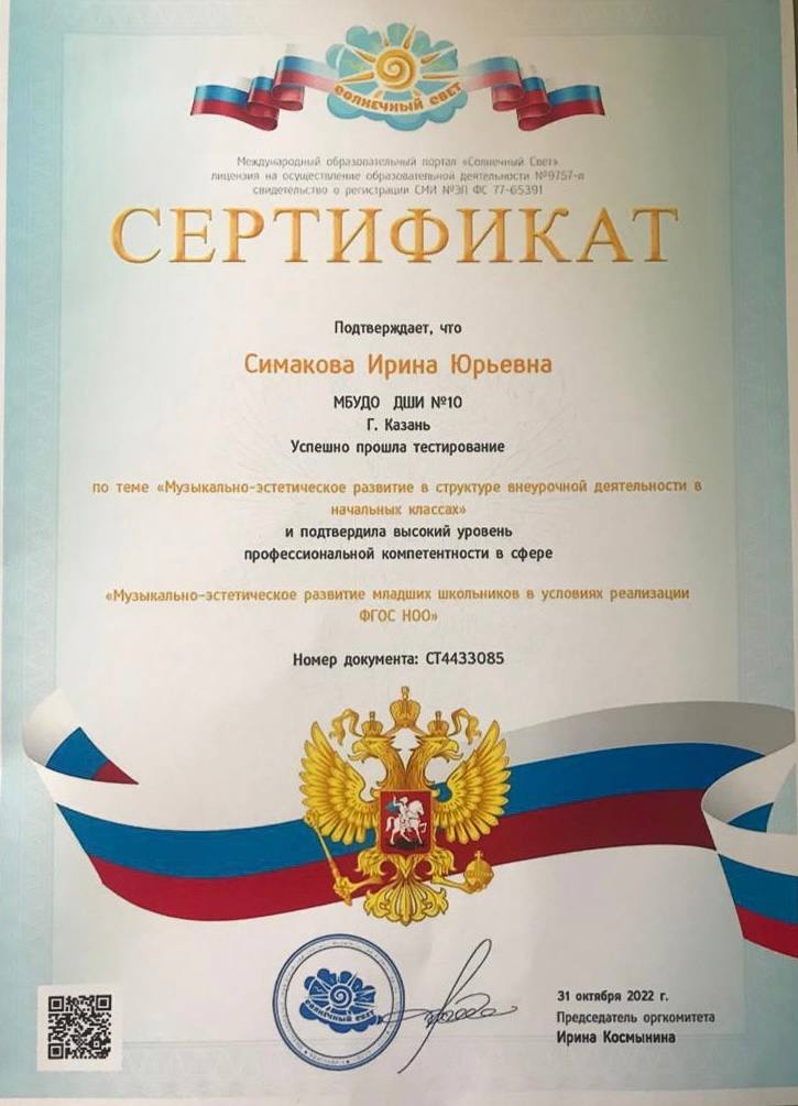 Поздравляем преподавателя Симакову Ирину Юрьевну с получением сертификата, который подтверждает, что она успешно прошла тестирование по теме «Музыкально-эстетическое развитие в структуре внеурочной деятельности в начальных классах» и подтвердила высокий уровень профессиональной компетентности в сфере «Музыкально-эстетическое развитие младших школьников в условиях реализации ФГОС НОО.»