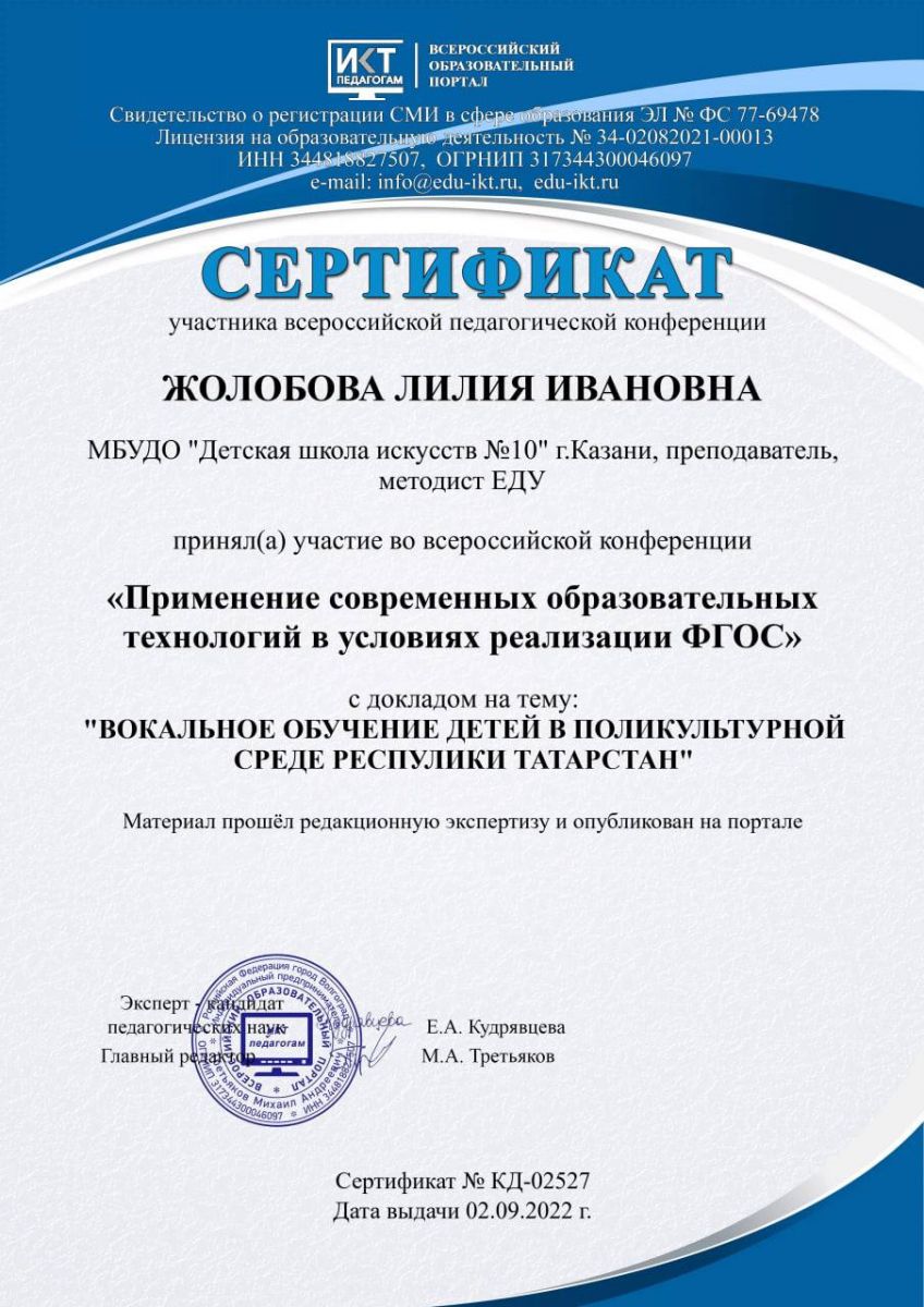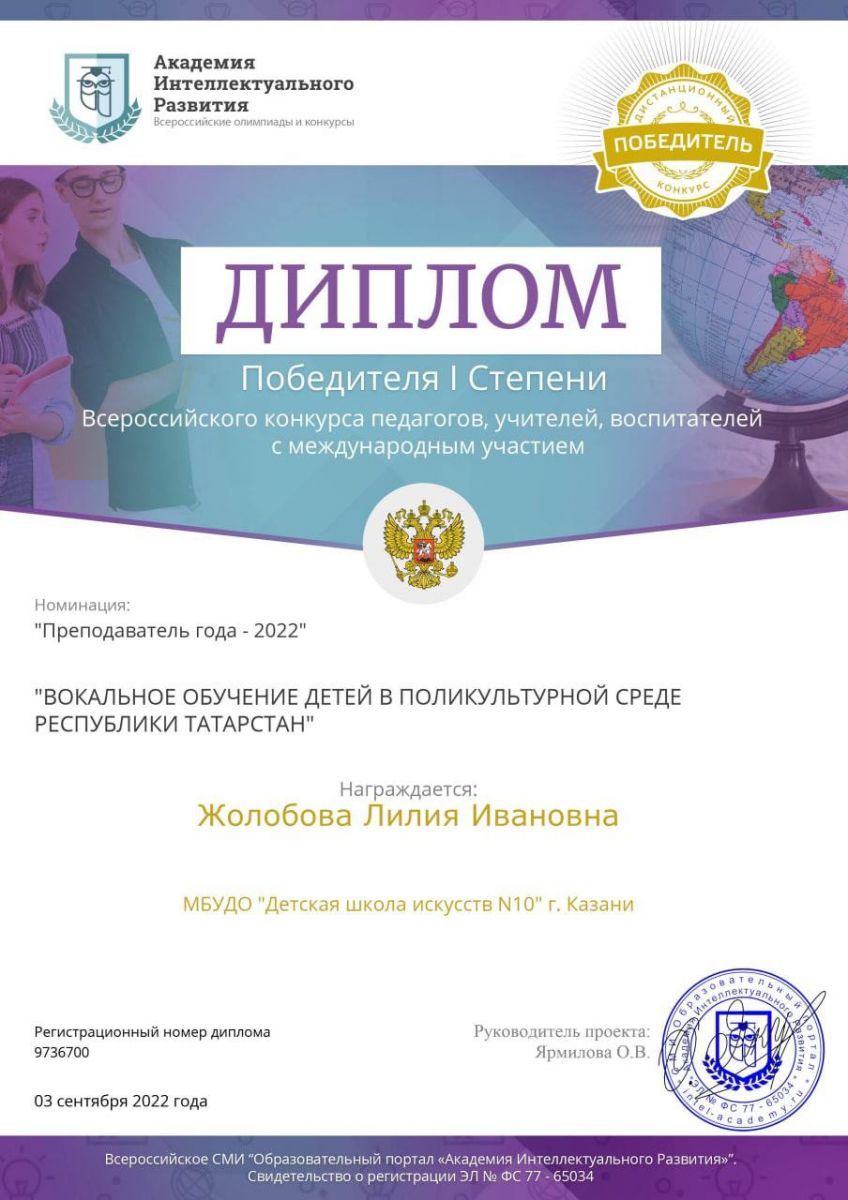 - диплом 1степени во Всероссийском конкурсе педагогов, учителей,воспитателей, в номинации «Преподаватель года 2022» с работой «Вокальное обучение детей в поликультурной среде Республики Татарстан, с которой приняла участие во Всероссийской конференции «Применение современных образовательных технологий в условиях реализации ФГОС».