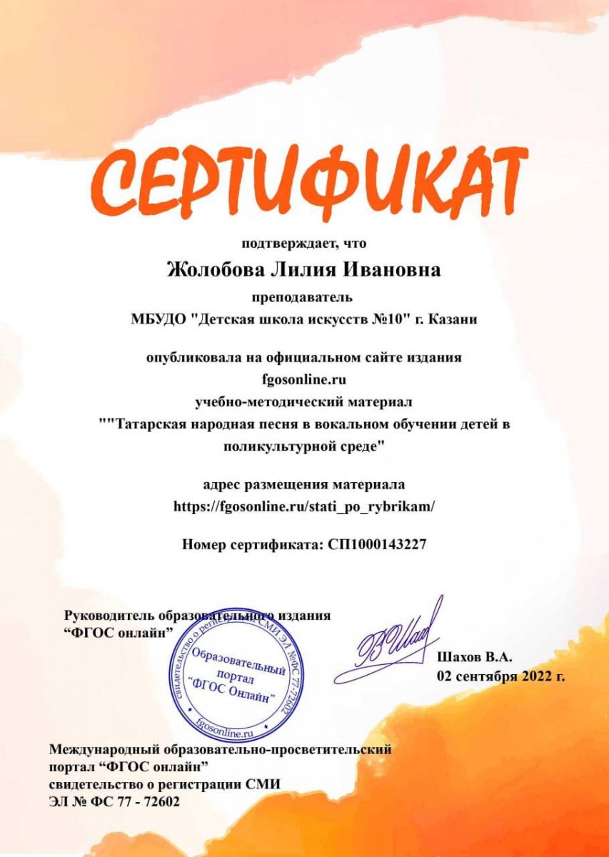 -сертификат о публикации на сайте fgosonline.ru учебно-методический материал «Татарская народная песня в вокальном обучении детей в поликультурной среде».