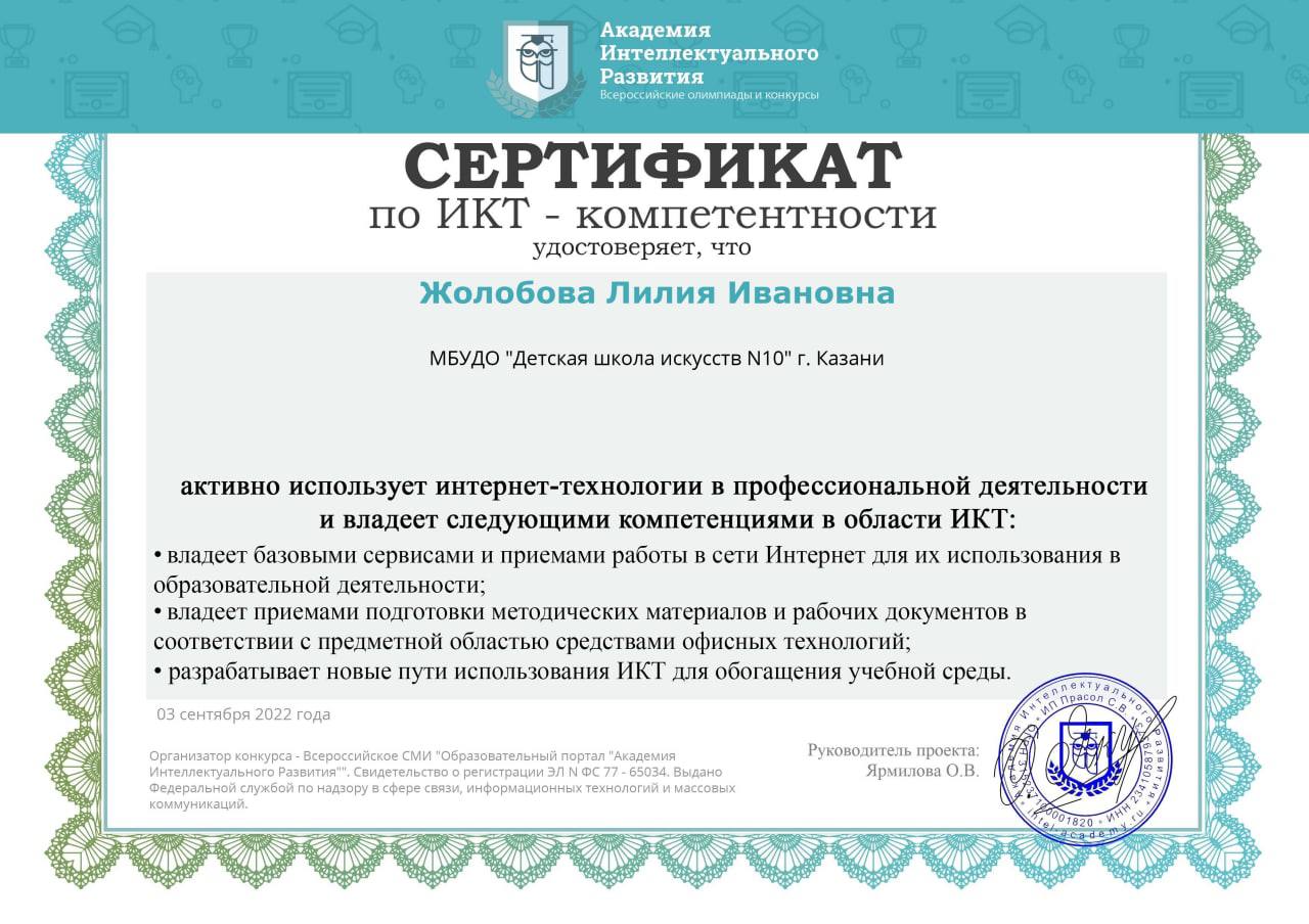 -сертификат по ИКТ компетентности,который удостоверяет,что Лилия Ивановна использует интернет-технологии в профессиональной деятельности.
