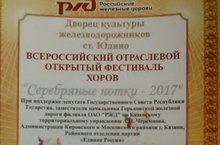22 апреля во Дворце культуры железнодорожников проходил Всероссийский отраслевой открытый фестиваль "Серебряные нотки - 2017". В конкурсе приняли участие младший хор "Конфетти" (руководитель Симакова И.Ю., концертмейстер Романова Т.Ф.) и старший хор "Созвучие" (руководитель Родионова Л.С., концертмейстер Слинкова О.В.).