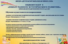 В первый класс школы принимаются дети 6,5 - 9 лет, 9 - 12 лет на музыкальное отделение, 10 - 12 лет на отделение изобразительного искусства. Обучение осуществляется по дополнительным предпрофессиональным общеобразовательным программам в области музыкального искусства и художественного, и по общеразвивающим программам.