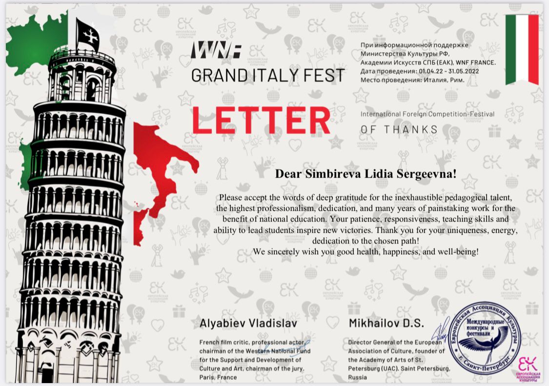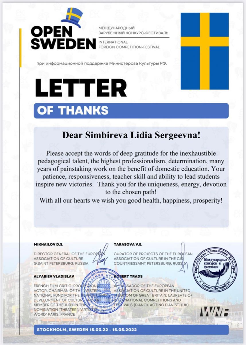 Поздравляем Симбирёву Лидию Сергеевну и ее учеников с отличными результатами и желаем двигаться дальше к новым ярким победам! Администрация школы выражает благодарность преподавателю Симбирёвой Л.С. за подготовку учащихся к конкурсу.