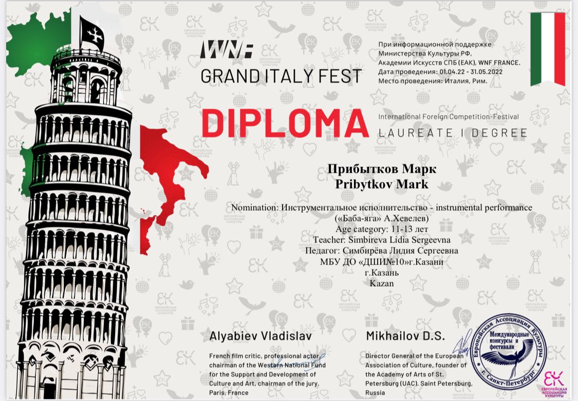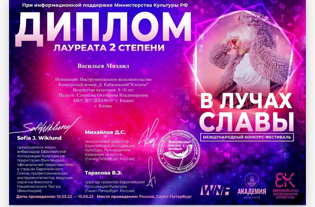 Батыршин Динар - лауреат 1 степени, диплом куратора Ефграфовой А.Ф.,