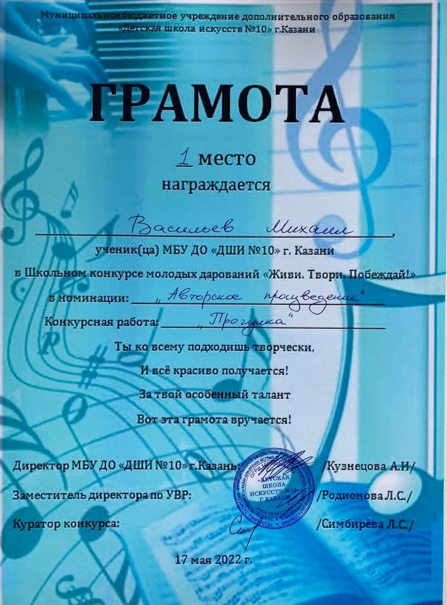 В МБУДО "Детская школа искусств №10" г. Казани проходил школьный конкурс молодых дарований "Живи! Твори" Побеждай!", где учащиеся могли показать свои авторские сочинения. Бадышева Алия представила стихи собственного сочинения и стала победителем в номинации "Авторское стихотворение", а Васильев Михаил преставил музыкальное инструментальное произведение "Прогулка" в номинации "Авторское произведение" и стал победителем! Поздравляем учащихся и автора проекта Симбирёву Лидию Сергеевну. Администрация школы выражает благодарность преподавателю Симбирёвой Л.С. за идею и сопровождение проекта!