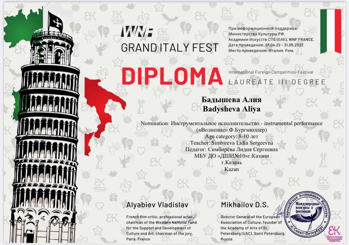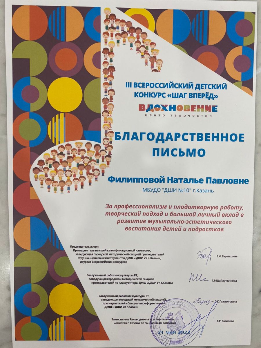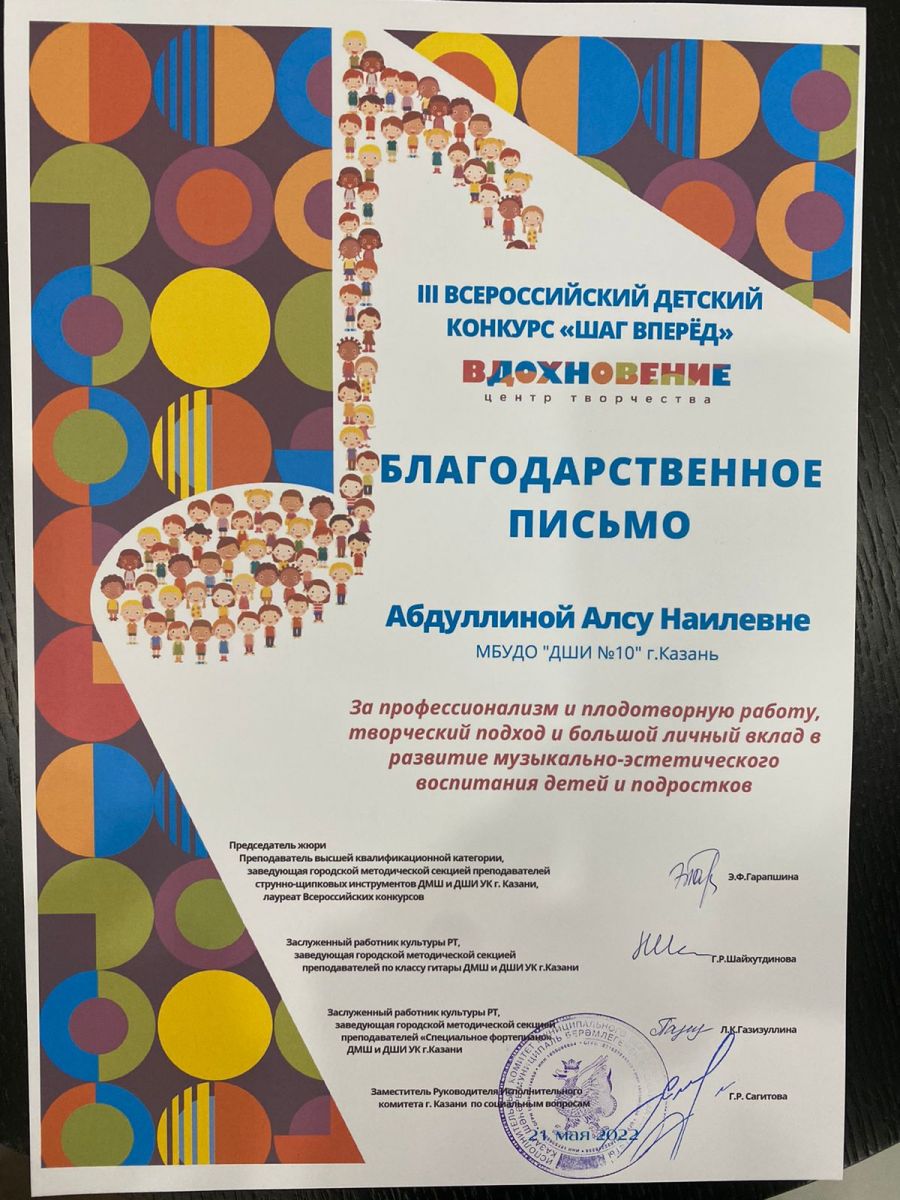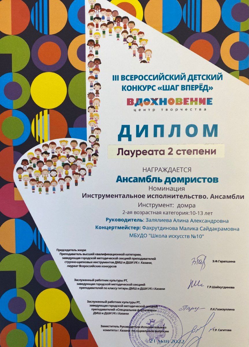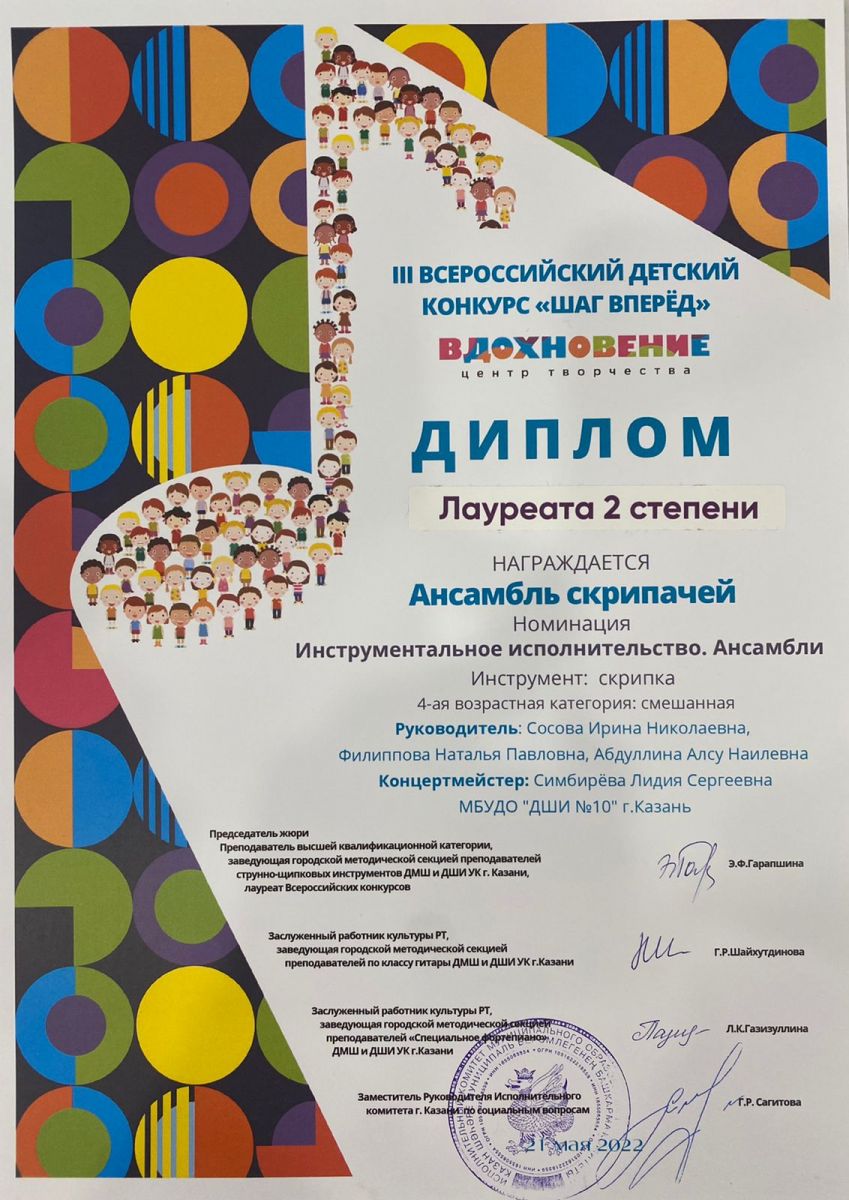 Поздравляем! Камалиева Риана - лауреат 1 степени, Бикбулатова Лия - лауреат 1 степени, Иматдинова Амина - лауреат 1 степени, лауреат 2 степени, лауреат 2 степени, Еремеева Эдита - лауреат 2 степени, Уразова Лейсан - лауреат 2 степени, лауреат 2 степени.