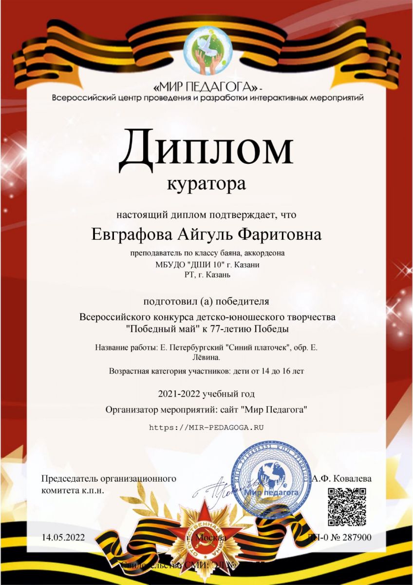 Учащиеся отделения "Народных инструментов" класса преподавателя Евграфовой Айгуль Фаритовны приняли участие во Всероссийском конкурсе детско-юношеского творчества "Победный май" к 77-летию Победы.