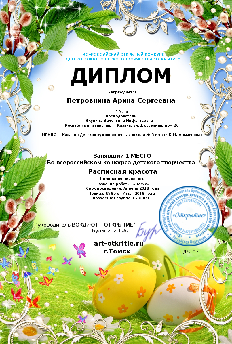 По итогам проведения Всероссийского открытого конкурса детского и юношеского творчества "Расписная красота", победителем стала: