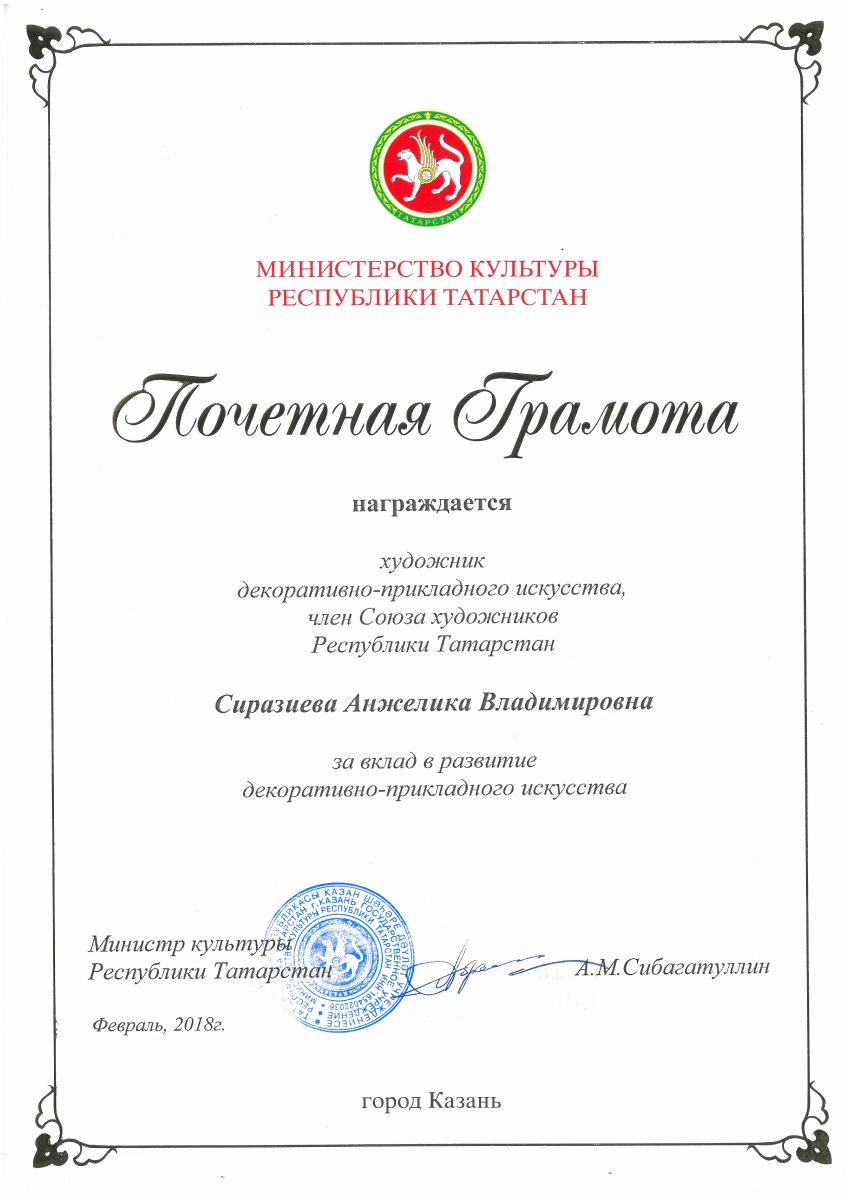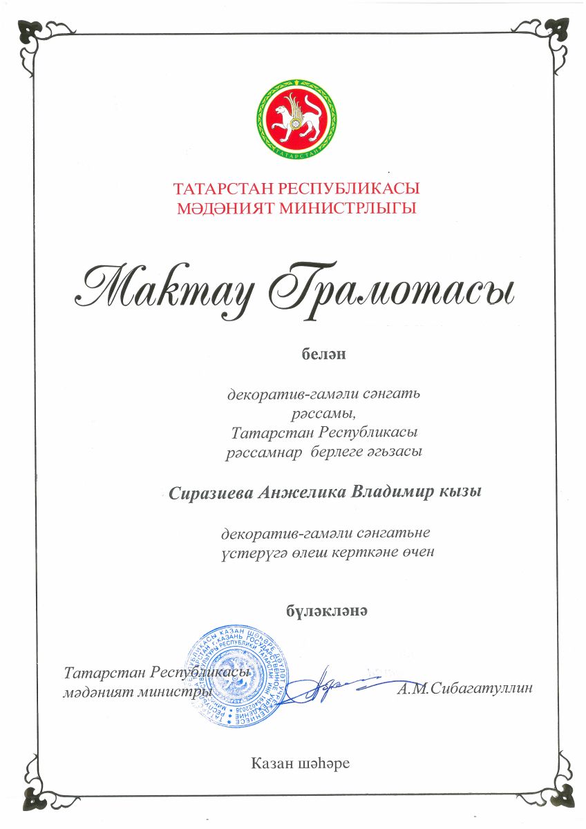 Преподаватель нашей школы Сиразиева Анжелика Владимировна была награждена Почётной грамотой Министерства культуры РТ.