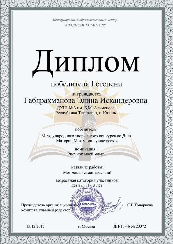 Габдрахманова Элина - диплом I степени - 1 "Б" класс, преп. Зубрилина Т.А.