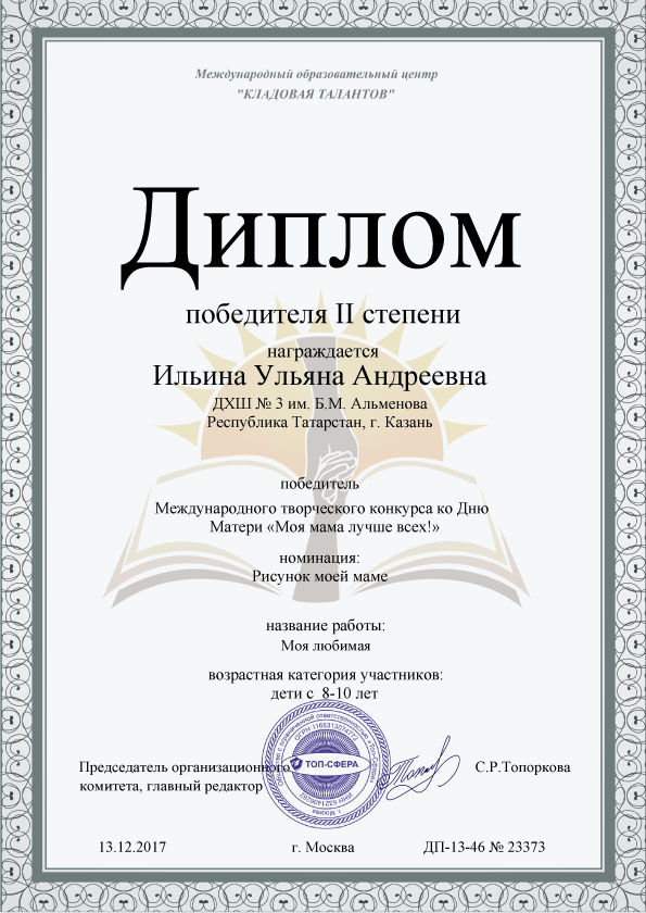 Ильина Ульяна - диплом II степени - 1 "Б" класс, преп. Зубрилина Т.А.