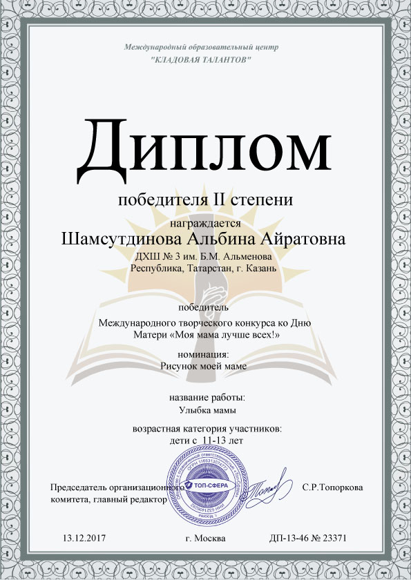Шамсутдинова Альбина - диплом II степени - 1 "Б" класс, преп. Зубрилина Т.А.