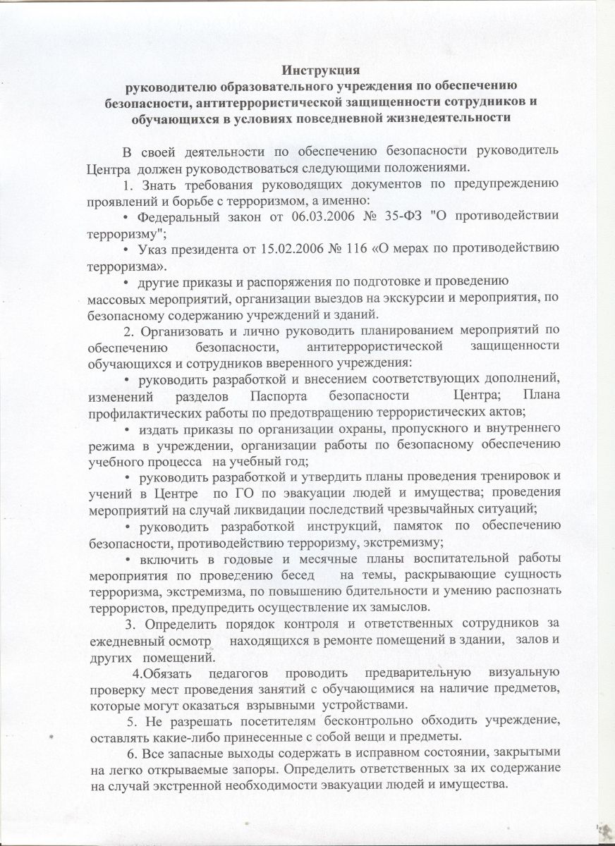 Инструкция руководителю образовательного учреждения по обеспечению безопасности, антитеррористической защищенности сотрудников и обучающихся в условиях повседневной жизнедеятельности