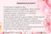 От всей души поздравляю Вас с профессиональным праздником - Днем учителя! Профессия учителя сочетает в себе мудрость и молодость души, креативность и огромную энергию, доброту и строгость! Желаю всегда сохранять в душе любовь к своей трудной, но такой важной и нужной профессии педагога. Пусть сил прибавляют Вам любовь и уважение Ваших воспитанников, гордость за их успехи и достижения, в которых немало и Вашей заслуги. Искренне желаю Вам крепкого здоровья, благополучия, оптимизма и новых трудовых успехов!
