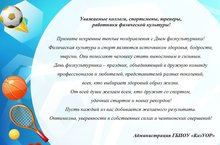 Физическая культура и спорт являются источником здоровья, бодрости, энергии. Они помогают человеку стать выносливым и сильным. День физкультурника – праздник, объединяющий в дружную команду профессионалов и любителей, представителей разных поколений, всех, кто выбирает здоровый образ жизни. От всей души желаем всем, кто дружит со спортом, удачных стартов и новых рекордов! Пусть каждый из вас добивается желаемого результата. Оптимизма, уверенности в собственных силах и чемпионских свершений!Администрация ГБПОУ «КазУОР»