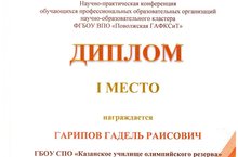 В мае на Научно-практической конференции обучающихся профессиональных образовательных организаций научно-образовательного кластера ФГБОУ ВПО "Поволжскка ГАФКСиТ" с успехом выступили студенты ГБОУ СПО "Казанское училище олимпийского резерва" Гарипов Гадель - 1 место, Ермакова Екатерина - 2 место. Поздравляем Катю и Гаделя, а также их руководителя Загидуллина Р.А. с победой, желаем дальнейших успехов в учебе и спортивных достижений.
