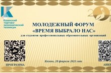 В соответствии с календарным планом мероприятий НП «Совет директоров образовательных учреждений СПО Республики Татарстан» на 2022-2023 уч. год 28 февраля 2023года на базе ГАПОУ «Казанский торгово-экономический техникум» состоится молодежный форум «ВРЕМЯ ВЫБРАЛО НАС».