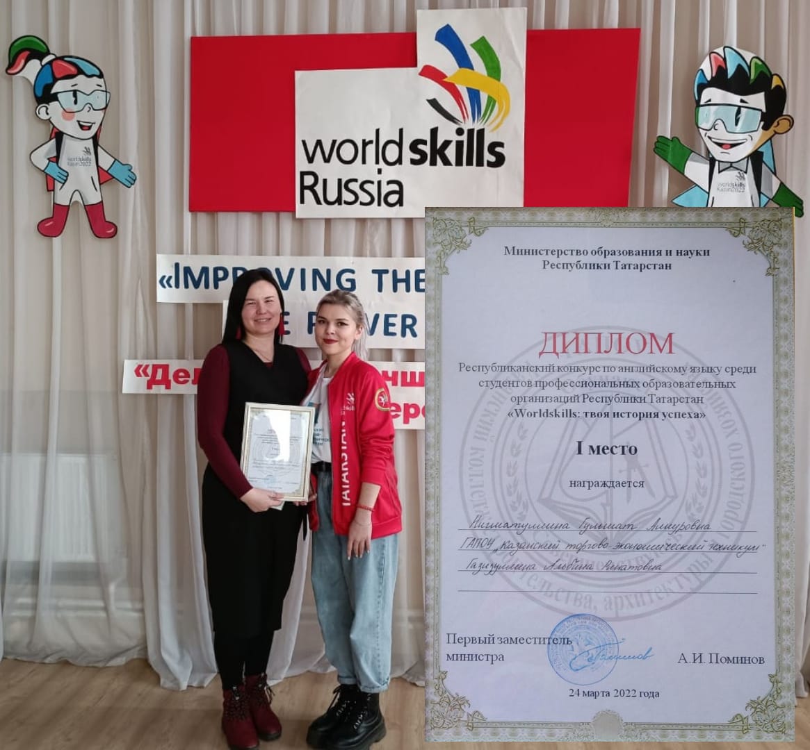 Победителями конкурса признаны студентка 3 курса Нигматуллина Гульшат и ее научный руководитель – Газизуллина Альбина Ринатовна. Они сумели создать оригинальную презентацию на английском языке на тему «WorldSkills: твоя история успеха», в которой рассказали как об участии образовательного учреждения в движении WorldSkills, так и собственном успехе участия в чемпионатах по компетенции «Туризм»; защитить эту работу, покорив сердца жюри. Кроме того, Гульшат правильно ответила на тестовые вопросы и задания по аудированию на тему «История движения WorldSkills» и заслуженно стала победителем! Желаем дальнейших успехов!