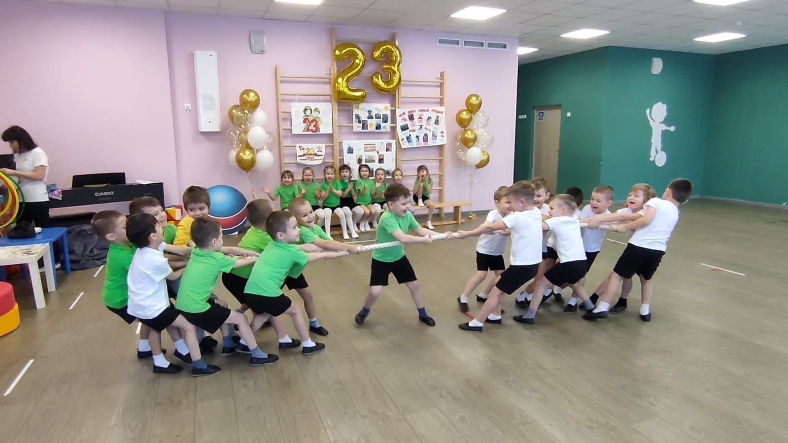 Бәйрәм уен эшчәнлеге элементлары белән узды. Зурлар төркемнәрендә тәрбияләнүчеләр шигырьләр сөйләделәр, табышмаклар чиштеләр, әтиләре белән бергә ярыштылар һәм хәрәкәтле уеннар уйнадылар.