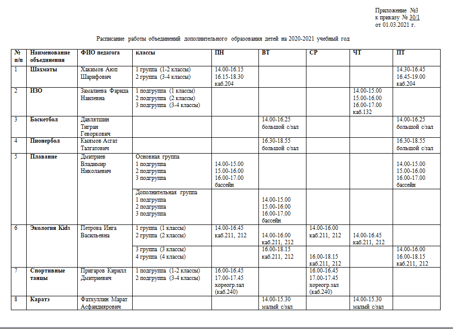 Расписание дополнительных общеобразовательных программ на 2020/2021 учебный год