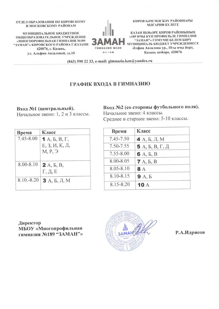 График входа в Гимназию на 2021/2022 учебный год