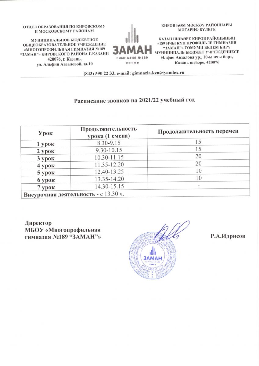 Расписание звонков на 2021/2022 учебный год