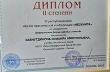 Поздравляем учителя английского языка Зайнутдинову Земфиру Амирзяновну, получившую диплом II степени в IV республиканской научно-практической конференции "Неокнига". Желаем успехов!