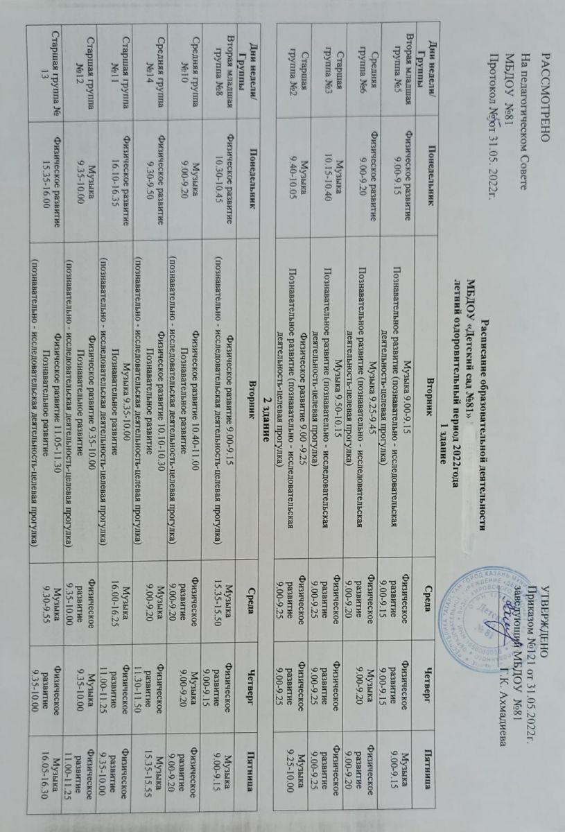 Расписание ООД на 2021-2022 учебный год 2 здание